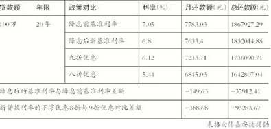 以20年期限的100萬元放貸計算,按照每月均等的還款方法,此次降息前利率為7.05%,月均還款7783元,支付利息總額86.7927萬元;而按照降息25個基點之后利率為6.8%,月均還款7633.4元,下降了接近150元,利息總額83.2萬元,減少了3.6萬元。