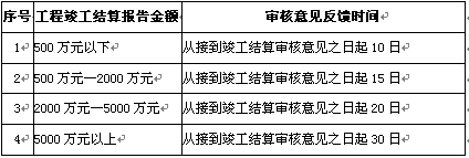 (2)審核工程竣工結(jié)算時(shí)限 發(fā)包人應(yīng)按以下規(guī)定時(shí)限進(jìn)行審核,并提出審核意見(jiàn)。