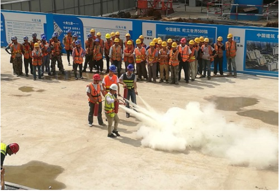 演練活動開始前,由總包單位進行消防器材的演練培訓,指導現場各個工種如何正確使用消防器材。隨后,項目部負責人宣講本次安全月的主題以及組織本次安全應急活動的必要性。最后,由監理單位,總包單位及分包單位等一起進行消防應急演練活動并圓滿完成。