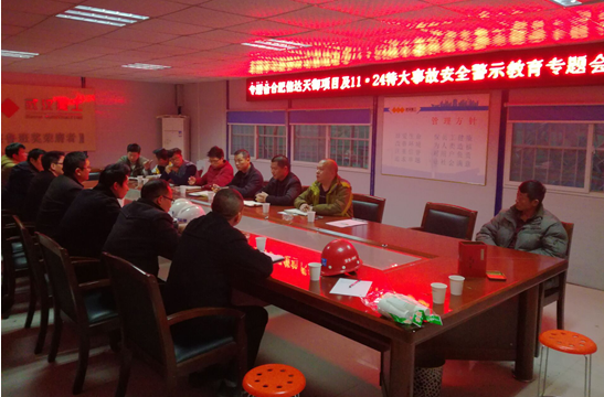 2016年11月30日,阜陽濱河花園項目部組織召開合肥信達天御及11.24特大事故安全警示教育專題會,中建五局、武漢建工項目部管理人員、安全員,合肥豐潤、浙江江南監理部全體成員參加了會議。