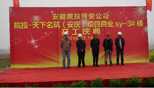 2016年3月18日上午,安慶天下名筑項目商業3#樓舉行項目開工典禮,現場彩旗飄揚、鞭炮齊鳴,皖投同安公司、安徽南巺監理公司、安徽三建工程公司及合作單位相關人員參加開工儀式。