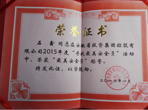 近日,皖投同安公司副總經理石鑫榮獲集團公司2015年度“最美安全員”稱號。