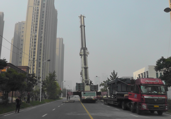 2012年10月28日,湖東景園項目制冷站泵房內溴化鋰機組正式開始吊運進場。上午8時許,號稱安徽第一,最大起重量為500噸的吊車停靠在湖東景園項目A地塊施工圍墻外預定工作區域,湖東景園項目部、熱電集團工程分公司和監理公司對吊裝前安全操作進行最后一次現場溝通并提出相關要求,而后,吊車在進行了必要的測試和負重等準備工作后,10時許吊運工作正式開始。