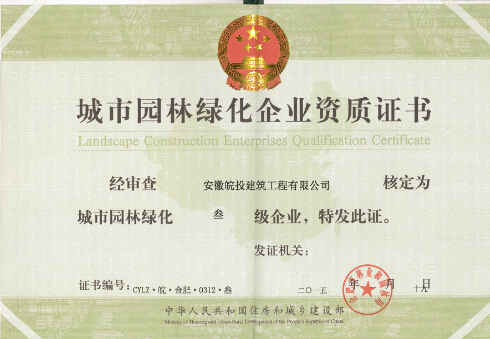 2015年1月27日,安徽皖投建筑工程有限公司正式取得園林三級資質。自2014年7月以來,建筑公司根據制訂的資質申報計劃,有條不紊的進行資質相關軟件、硬件及人員資料的準備,于2014年底上報審批部門,并于2015年元月順利取得資質。 建筑公司園林三級資質的成功取得,為實現建筑公司2015年“服務置業、人才培養、協同物業”三大戰略定位和可持續發展鋪平道路。