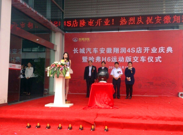 2014年5月18日,長(zhǎng)城汽車安徽翔潤(rùn)4S店開業(yè)慶典暨哈弗H6運(yùn)動(dòng)版交車儀式在蚌埠(皖北)國(guó)際汽車城盛大舉行。4S店董事長(zhǎng)兼總經(jīng)理陳文鋼一行出席慶典儀式。