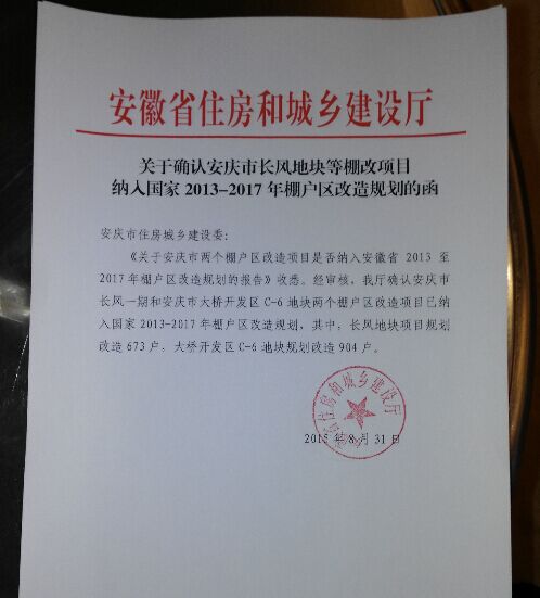 2015年8月31日,皖投同安公司兩個(gè)在建棚改項(xiàng)目安慶市長(zhǎng)風(fēng)地塊和大橋開(kāi)發(fā)區(qū)C-6地塊獲安徽省住房和城鄉(xiāng)建設(shè)廳正式確認(rèn),納入國(guó)家2013-2017年棚戶(hù)區(qū)改造規(guī)劃。