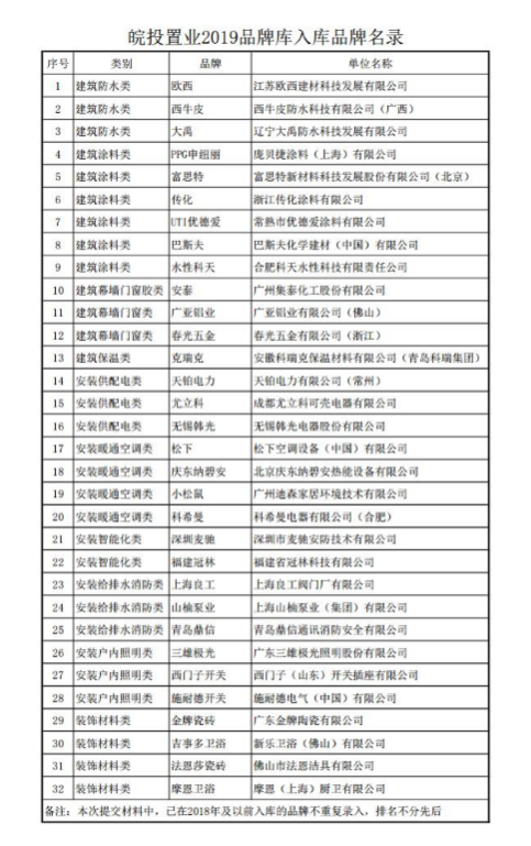 根據2019年皖投置業品牌庫修訂工作要求,公司設計研發中心組織完成皖投置業2019年品牌庫入圍評審工作。入庫共收到申報材料67家,經專家組評審、審計全程監督,最終確定本次入庫品牌32家(具體名單見附件)。現將評審結果予以公告。