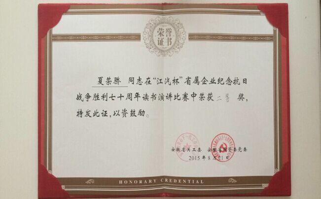 2015年8月21日,由省關工委、省國資委黨委、省國資委關工委聯合舉辦的大型演講比賽在江汽集團研發中心隆重舉行,三十余家省國資企業參賽,經過激烈角逐,代表我司及集團公司參賽的夏榮驕同志以一篇《回憶里選擇未來》打動了評委及現場觀眾,獲得評委高度贊揚并榮獲二等獎,充分展示了國企員工的風采,為集團公司和我司爭得了榮譽。